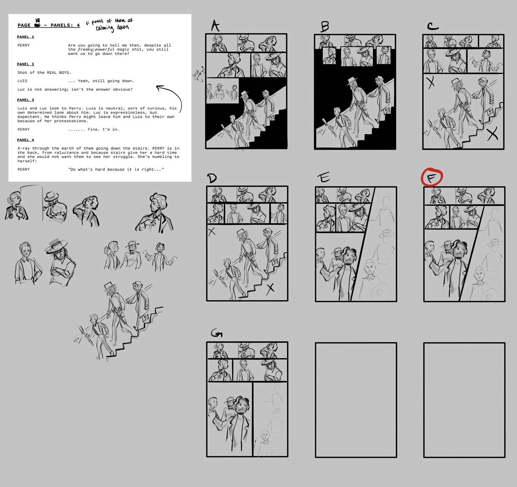 This page represents a downbeat between action-packed scenes, so I used a full-width horizontal panel at the top to create breathing room. I used a vertical panel to highlight the uncertainty the characters felt descending the stairs into darkness. While it’s unconventional for a vertical panel to be on the right side of the page, I felt this layout conveyed the sense of foreboding I was looking for.