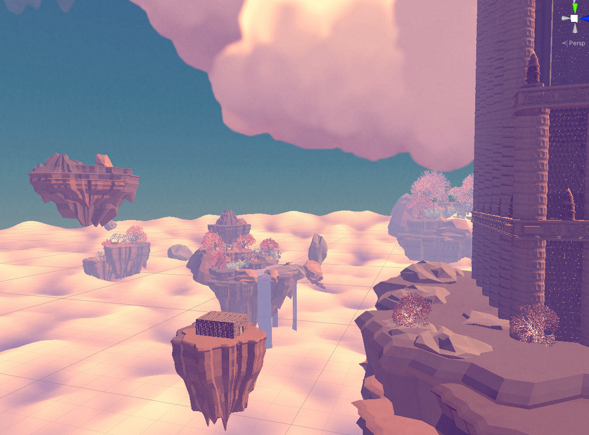 a monochromatic purple sketch of a fantasy environment with floating sky items.