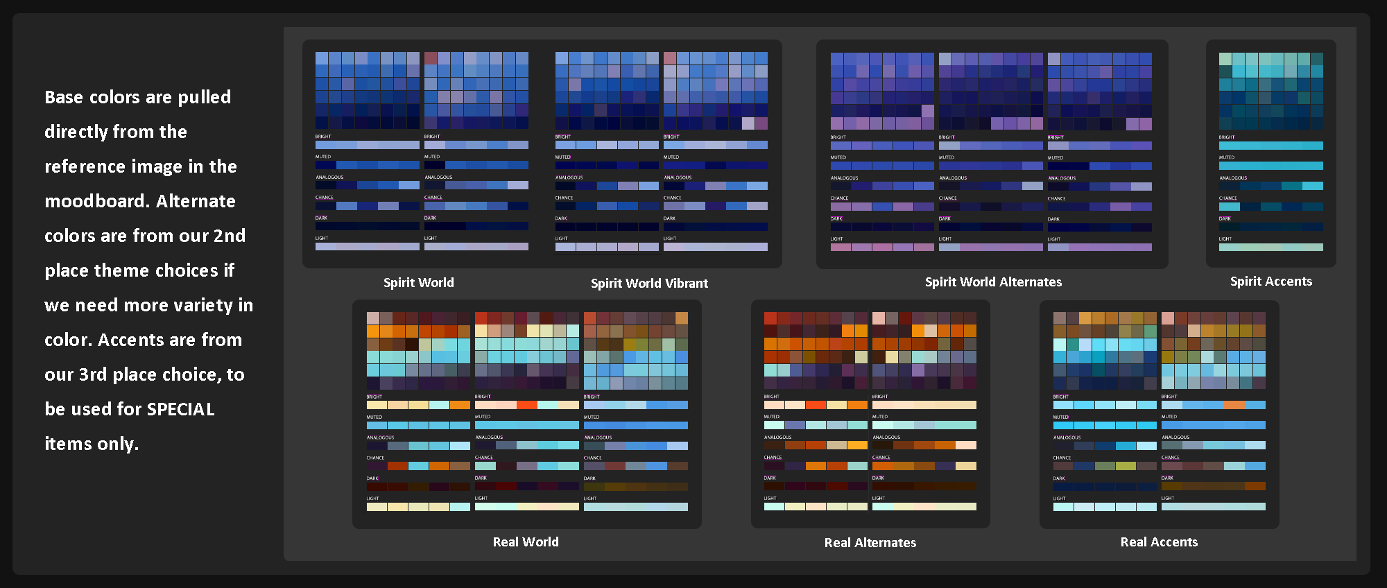 Duality has two different dimensions to every location within it: a “real world” version and a “spirit world” version which the player can travel between at will. To make sure that every possible version of any given location was accessible to colorblind players, I used image editing software to simulate the way that a colorblind person would perceive various color palettes used within the game world.